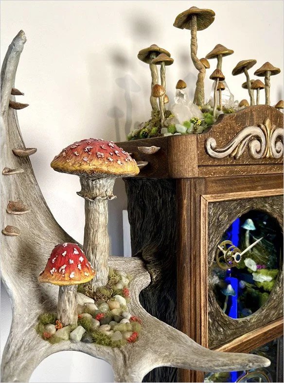 Drawing inspiration from fungi, natural medicines, upcycled antiques, and sacred geometry, Jai’s work bridges organic and symbolic worlds. His compositions juxtapose iconographic imagery and subtle nostalgia with moss-like textures, vibrant colour palettes, and unmistakable mushroom forms. These elements create visual environments that feel playful, immersive, and contemplative, inviting viewers into a deeper relationship with nature and imagination.